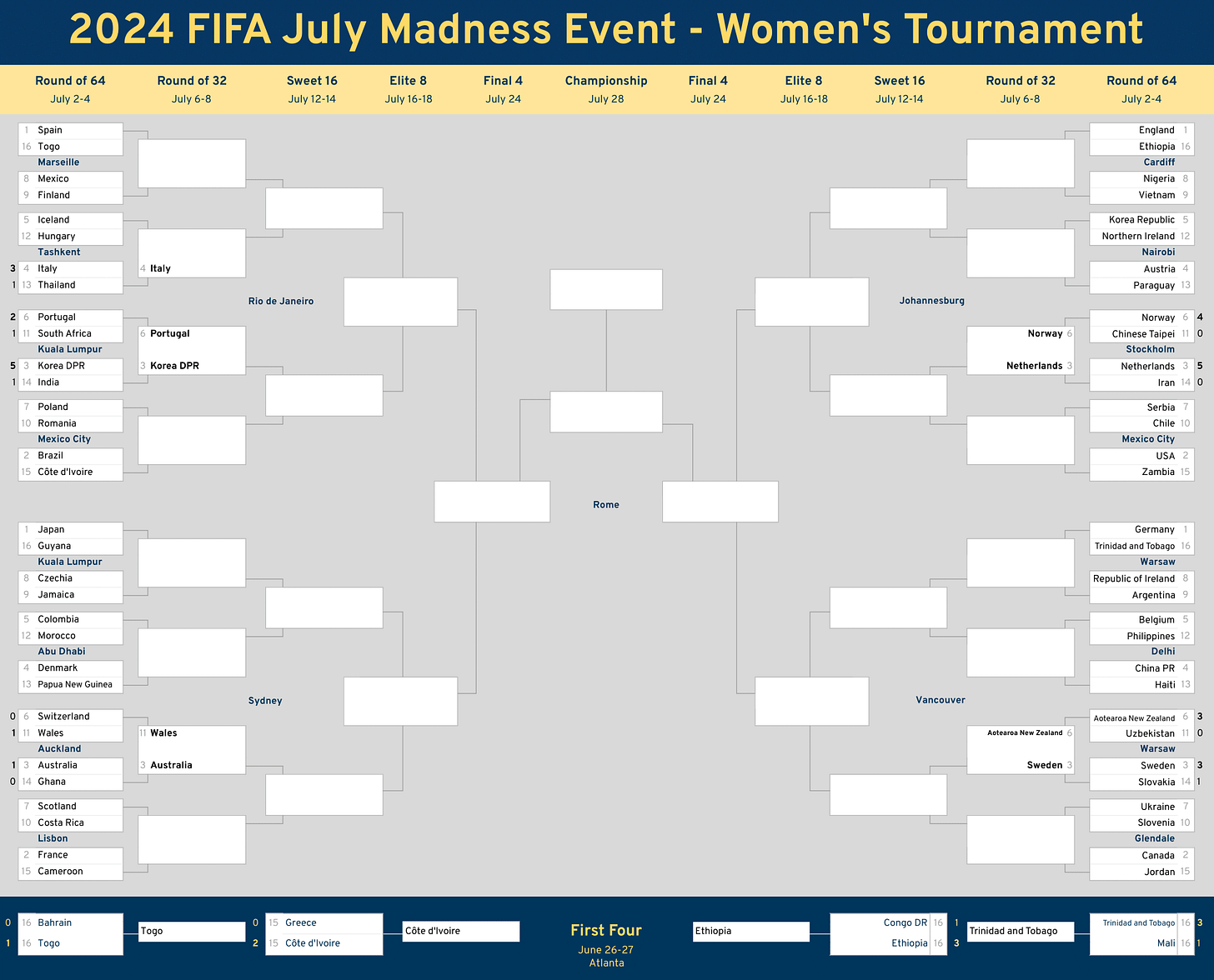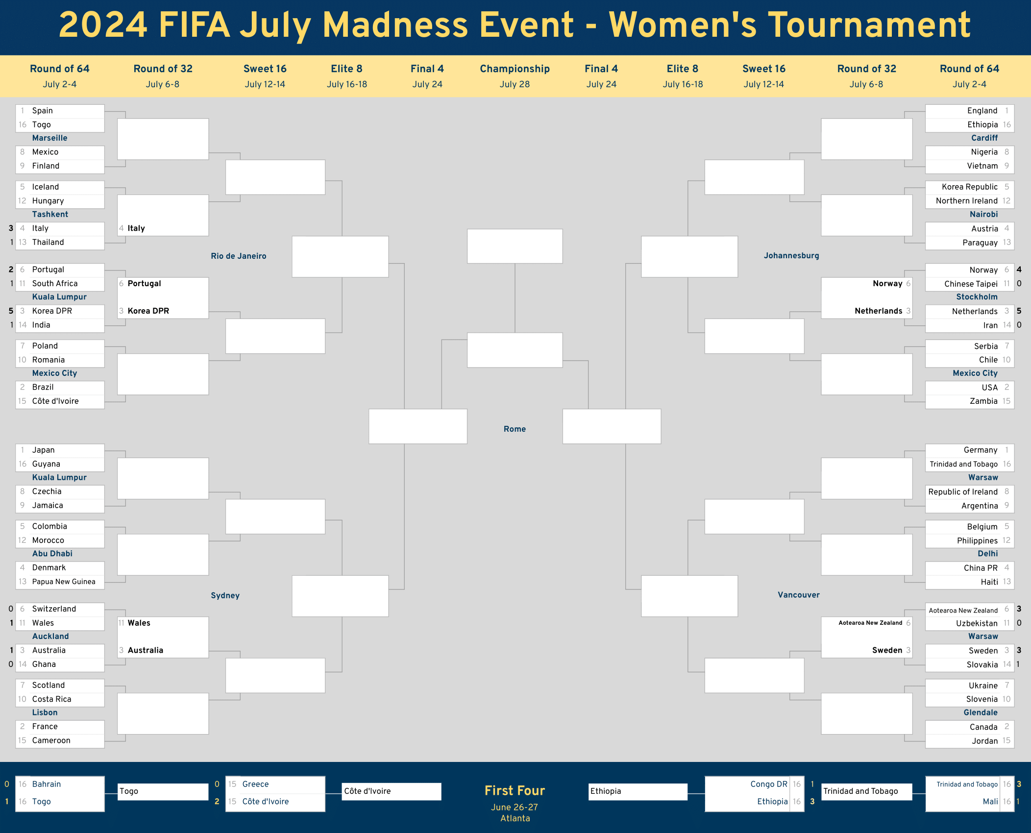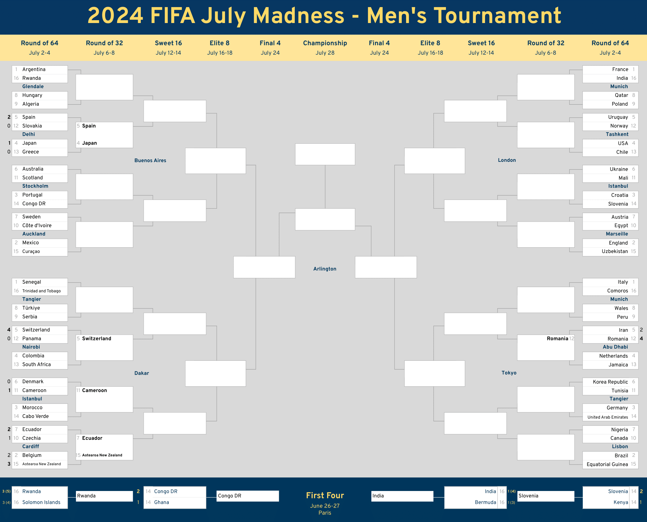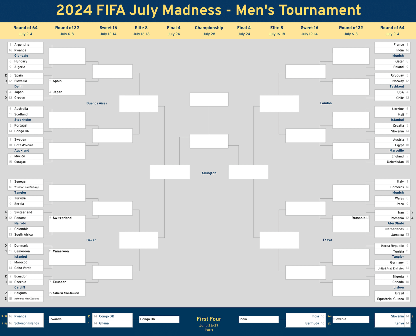 Each pod site will have two matches each on July 2 and 3. The same pod’s matches will play on the same day, 3 hours apart, most often at 1700 and 2000 local, but not always. Within a day, we tried to place matches at times most useful for TV for the home countries, but this was not always plausible. Countries could not, however, play both of their matches at overlapping times.