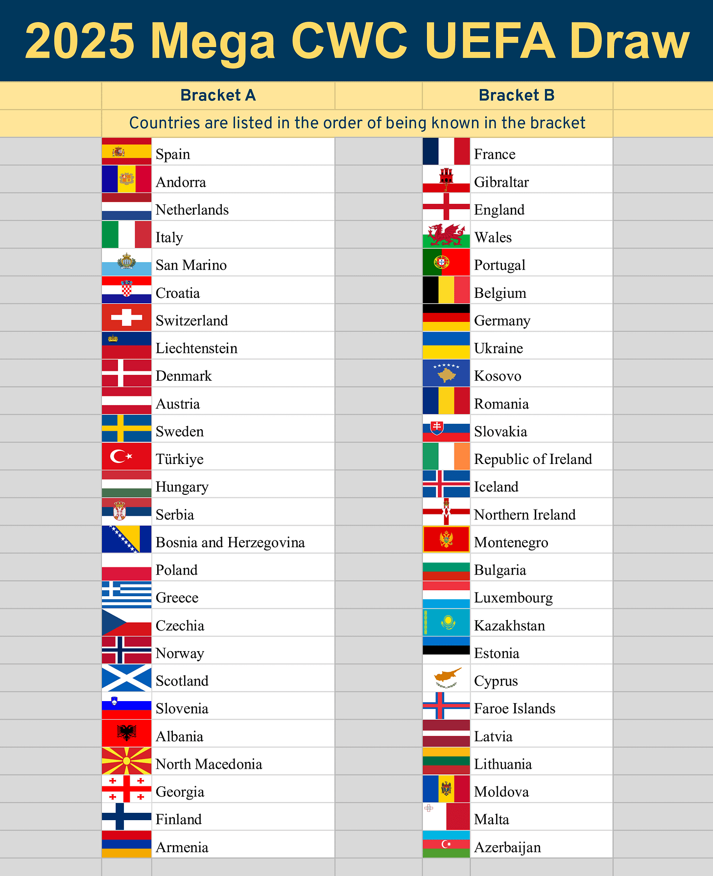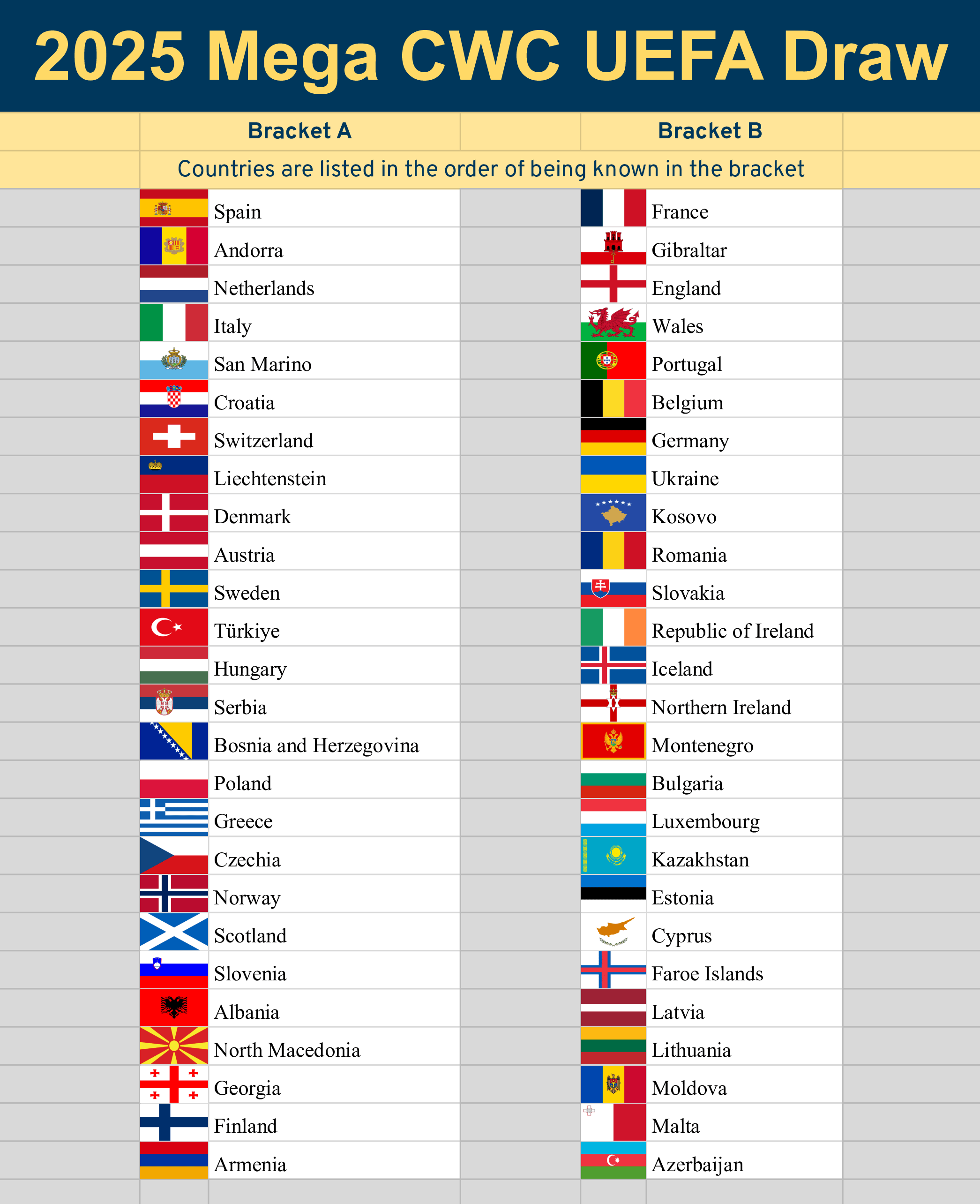 We’re going to thus split UEFA into 2 brackets that contain 26 countries each. We’ll do this in a very straightforward way, for the most part.